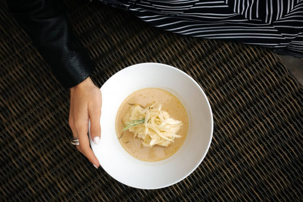 5. Placer chaque morceau de cabillaud sur un plat, en veillant à orner chacun de quelques tranches de lemon-grass et morceaux de gingembre. Verser plusieurs louches de bouillon sur le cabillaud, avant d’arroser le tout, pour finir, d’un filet d’huile d’olive. Servir selon son goût — notre recommandation : servir avec une pomme de terre en robe des champs croustillante à point saupoudrée d’une légère pincée de fleur de sel.